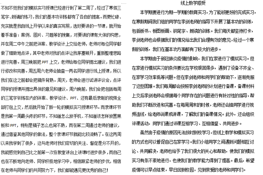 3. 疫情期间不得已的选择,实习生无法进入课堂面对学生。模拟试讲全部按照备课时预设情境来进行,无法锻炼实习生灵活应对课堂突发状况的能力,也无法提升实习老师与学生沟通交流的能力。