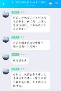 正式网课如约而至,我们精神饱满的开始了学习。当然,小插曲也时有发生,比如由于网络的原因,画面出现延迟甚至消失。此时,我们会通过弹幕向老师反馈直播问题,老师也会第一时间进行调试。在不断的磨合中,网课学习已变得愈发得心应手。