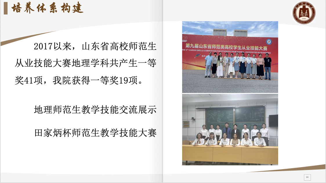 地理师范生的地理教学技能和教育理念不断进步,在全国地理师范生教学技能交流展示、田家炳杯师范生教学技能大赛、山东省高校师范生从业技能大赛、山东省地理教学技能大赛等一系列国家级和省级教学技能大赛中取得优异成绩。在该培养体系下,老虎机
