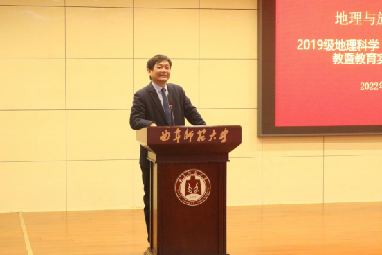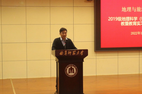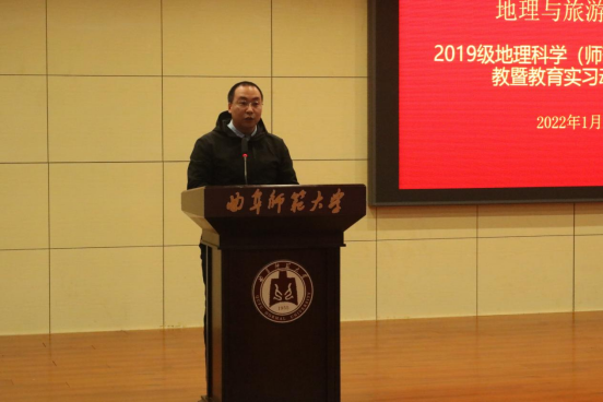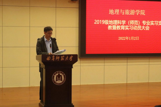 于1月2日下午召开2022年地理科学(师范)专业实习支教暨教育实习动员会。学院党委书记苏占兵、院长张全景、党委副书记刘伟出席会议。全体教育实习指导教师、辅导员和2019级地理科学(师范)专业及地理公费师范生全体同学参加了动员大会。副院长吴军主持动员会。