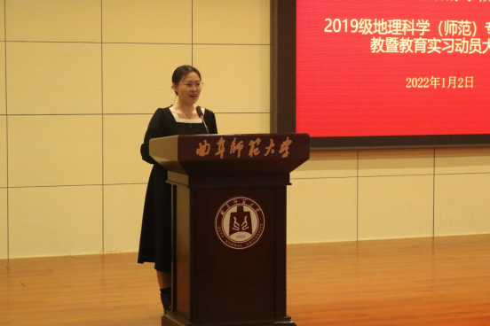李雅洁同学代表全体实习生发言,她表示作为一名准教师和实习生,她一定会虚心接受指导老师的意见并且切实落实到之后的教学工作中去,遵守规章制度,言行得体,充分展现曲园地理学子风采。并将抓住此次宝贵的实习机会,切实提高教学能力、教学管理能力、教学研究能力等教师专业素质,圆满完成教学实习任务。