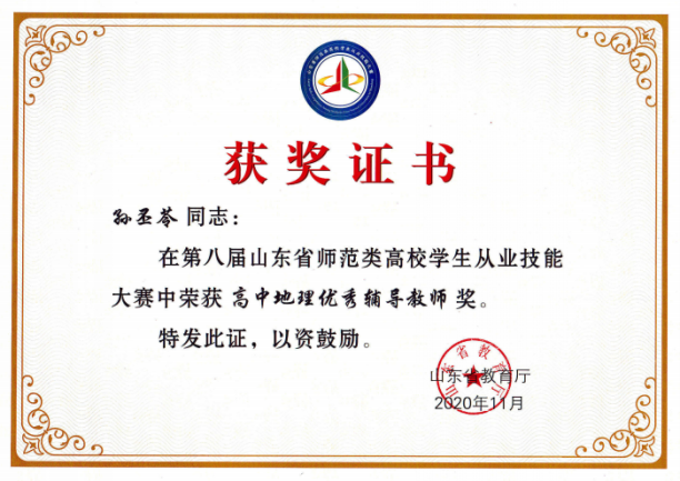 2020年第八届山东省师范类高校从业技能大赛指导吴梓华获高中地理(抽取组)一等奖,获评高中地理组优秀辅导教师;
