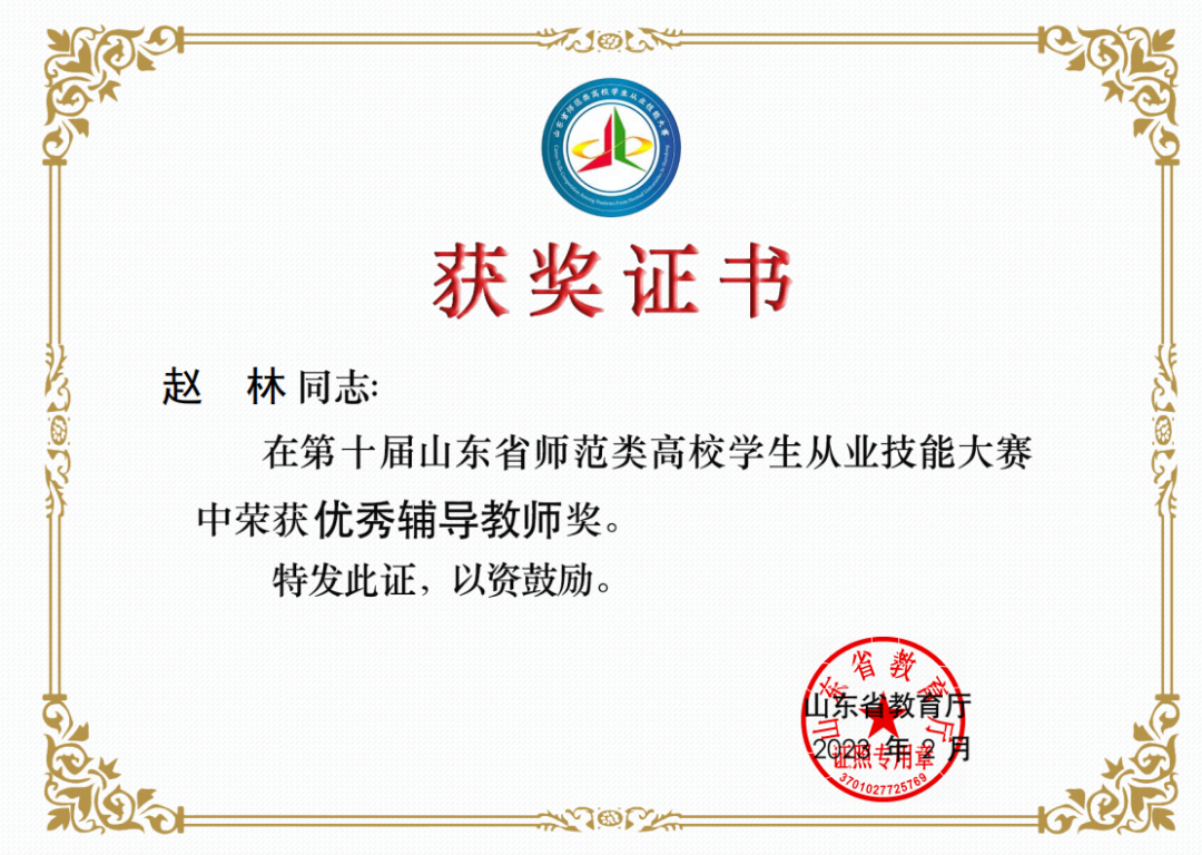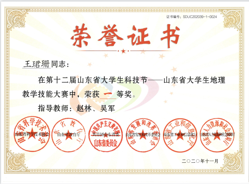 指导学生连续三年获得山东省大学生科技节地理教学技能大赛一等奖,连续三年获评山东省大学生地理教学技能大赛优秀指导教师。