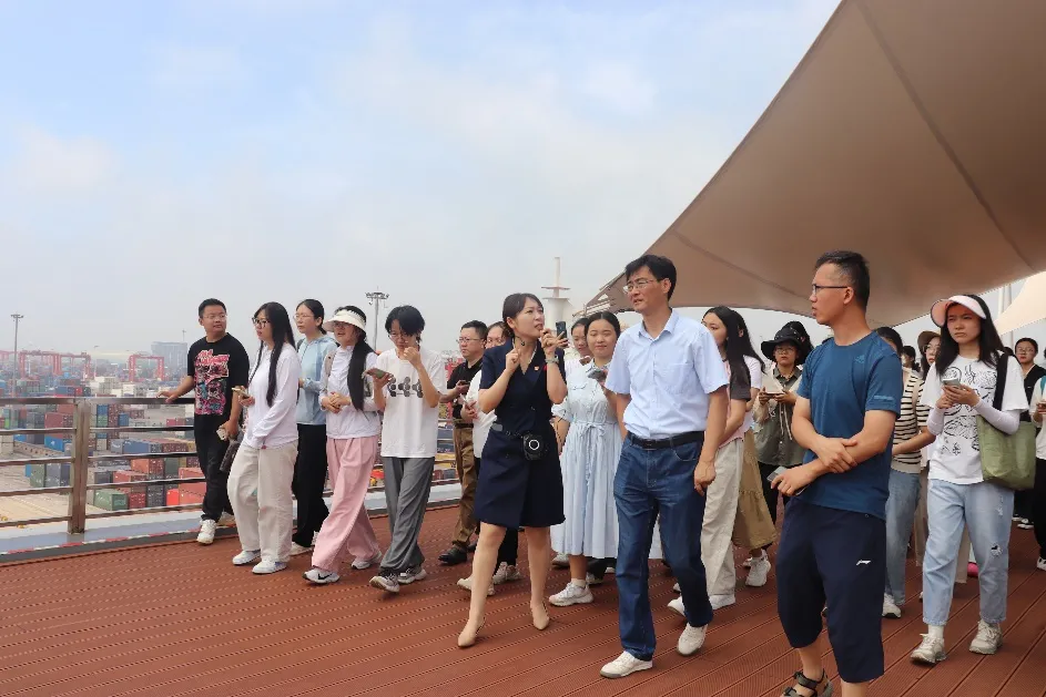 7月15日上午,集体前往日照港考察学习。在观看了日照港发展现状的纪实影像后,同学们登上观景台俯瞰日照港。在观景台上,张学波对日照港功能布局、运营现状及发展规划进行了讲解,结合同学们看到的集装箱龙门吊、货物传送带等设施进行了分析。在日照港老灯塔和石臼港煤码头工程纪念广场,张学波讲述了石臼港建设的历史和发展历程,介绍了海龙湾退港还海工程的建设规划,引导同学们对港城融合及健康发展进行思考。