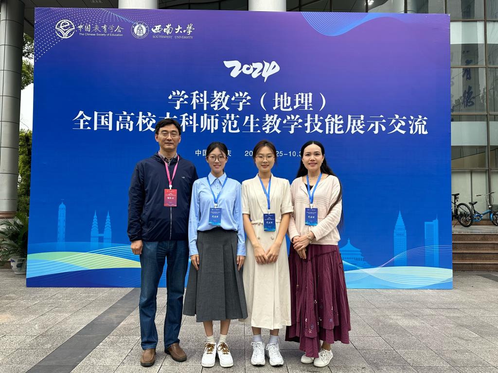 2021级地理科学(师范M)专业王婧同学和2022级地理科学(师范)专业由京鹭同学,分别在李剑、吴军老师指导下,获小组第一名和第四名,均被评为“未来优秀地理教师”。王婧同学获得最佳教学课件(每组第一)、最佳教学仪态等专项奖,由京鹭同学获得最佳教学课件、最佳教学语言和最佳师生互动等3个专项奖。王婧同学表现突出,成为全国仅有的三位本科生代表之一,受邀参加中国教育学会地理教学专业委员会2024年综合学术年会展示交流活动,中国教育学会地理教学专业委员会理事长段玉山教授等专家给予了肯定与鼓励,全国著名地理课程与教学论专家、华东师范大学夏志芳教授对授课展示进行了点评。