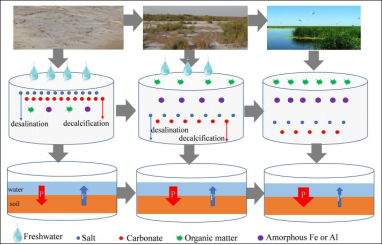 图1. 我国河口退化湿地恢复过程景观变化及土壤理化性质的改善、土壤磷吸附和释放特性示意图。