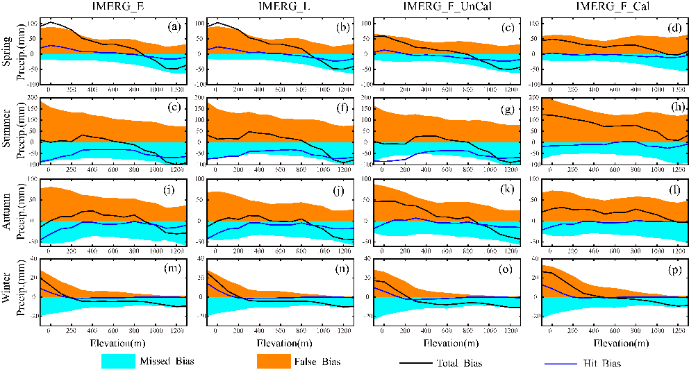 (2)IMERG 降水反演产品的误差与海拔高度密切相关。在春、夏和秋季,海拔低于800米时,误报偏差是主要的误差来源。而在冬季,漏报偏差主导了IMERG 降水反演产品的性能,导致降水事件的误检。