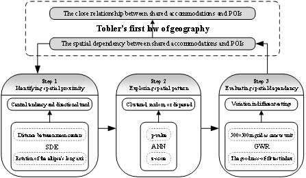 王铁教授与李梅副教授所在的研究团队基于Tobler第一定律(TFL),集成了标准偏差椭圆(SDE)、平均最近邻(ANN)和地理加权回归(GWR)等GIS方法,提出了一个三步分析框架,以检验Airbnb房源与城市兴趣点之间的空间邻近性并测量其依赖程度。研究以美国14个不同规模的城市为案例地,涵盖了122005个Airbnb房源和113169个POI数据。结果发现,Airbnb房源与POI存在普遍且显著的空间接近性,根据TFL,这说明Airbnb与POI之间存在密切的关系。然而,两者之间的空间依存度具有显著的场景性——不同城市、不同房源类型和POI类型之间的空间依赖程度存在差异。此外,一些在既有研究中经常被忽视的POI,如学校、邮筒、面包店和自行车租赁站等,展现出与Airbnb房源显著的空间依赖关系。