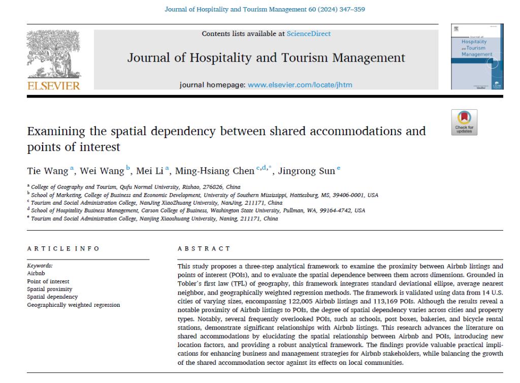 的王铁教授团队与Washington State University和University of Southern Mississippi等高校合作,在国际著名期刊Journal of Hospitality and Tourism Management(SSCI,中科院一区TOP)上发表了题为“Examining the spatial dependency between shared accommodations and points of interest”的研究论文。老虎机