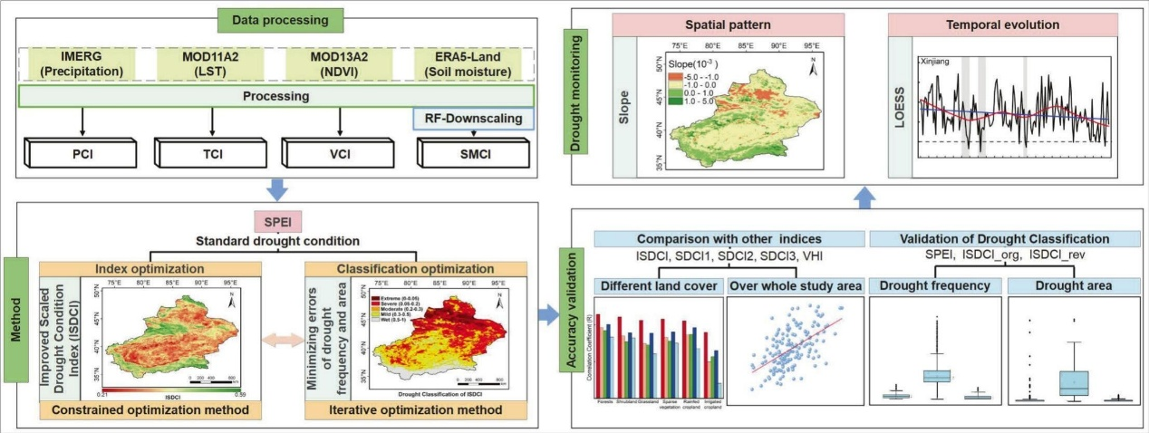 针对现有复合干旱指数在土壤湿度表征不足、变量权重依赖经验、干旱等级划分缺乏客观依据等问题,郭浩副教授团队提出改进型比例干旱状况指数(Improved Scaled Drought Condition Index, ISDCI),为干旱半干旱区的干旱动态精准监测提供了新方法。