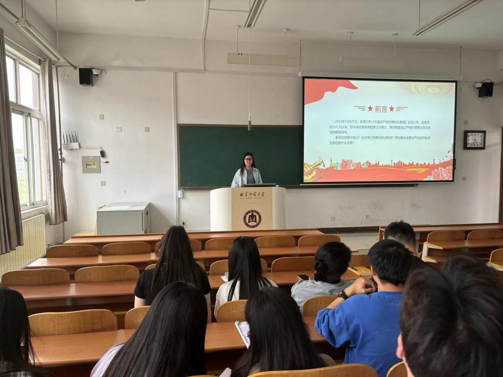 研究生第一党支部在S413教室召开党纪学习教育专题党课活动,本次党课由支部书记吕潇雨同志主讲,支部全体党员参加。