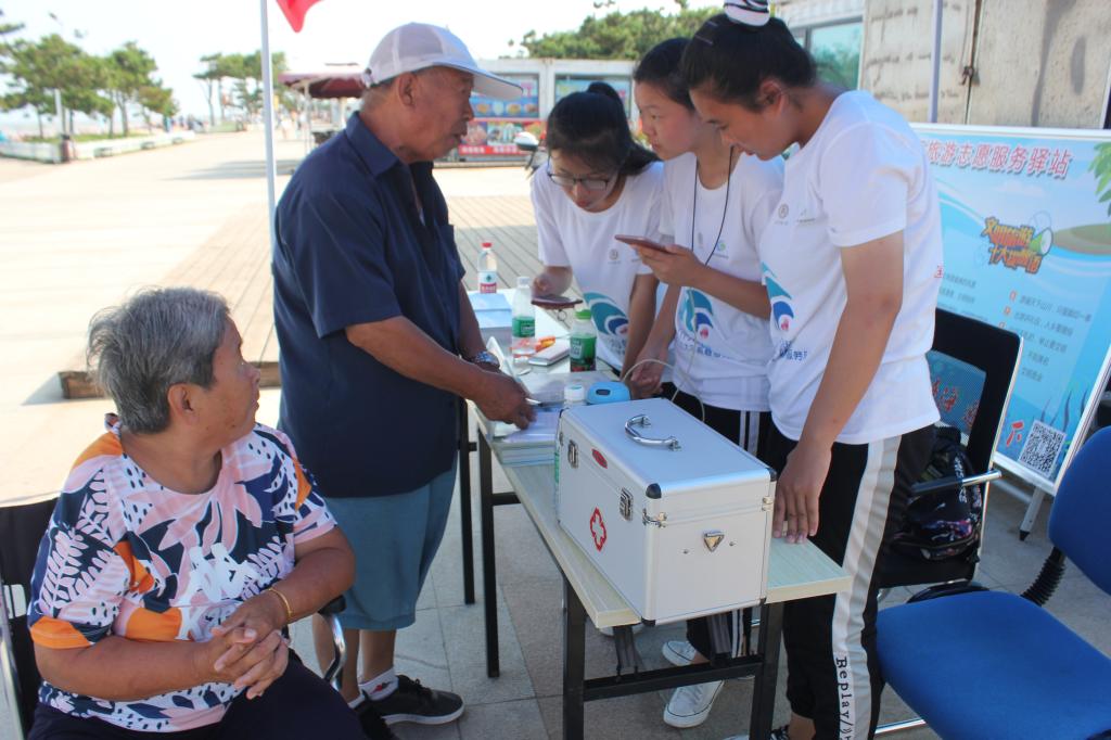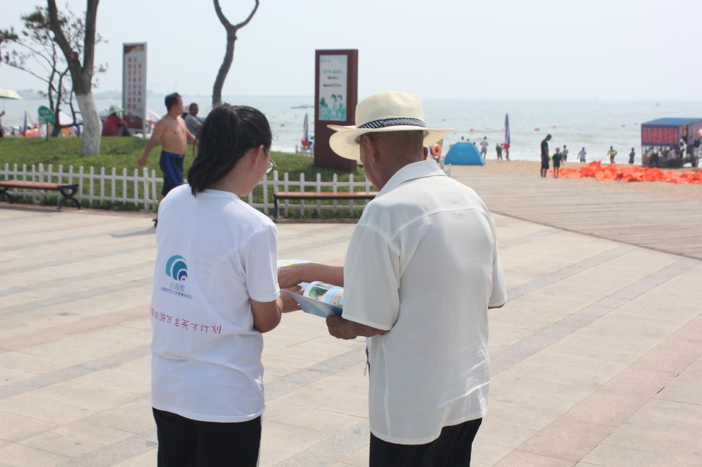 随后服务队在武老师和李局长带领下,依次到达三个服务地点:阳光海岸、李家台、任家台,搭建帐篷,准备资料,熟悉现场及服务流畅后,实践队员立即开展对游客的咨询服务。队员们的热情服务如同天上的骄阳一样,感染着周围每一位游客。周到热心的服务引来游客们的称赞,队员们纷纷表示将发挥自身最大的能力做好本次实践工作,服务好每一位需要服务的游客,让四海宾朋感受到山海天度假区美好的旅游环境和好客的渔家风情。