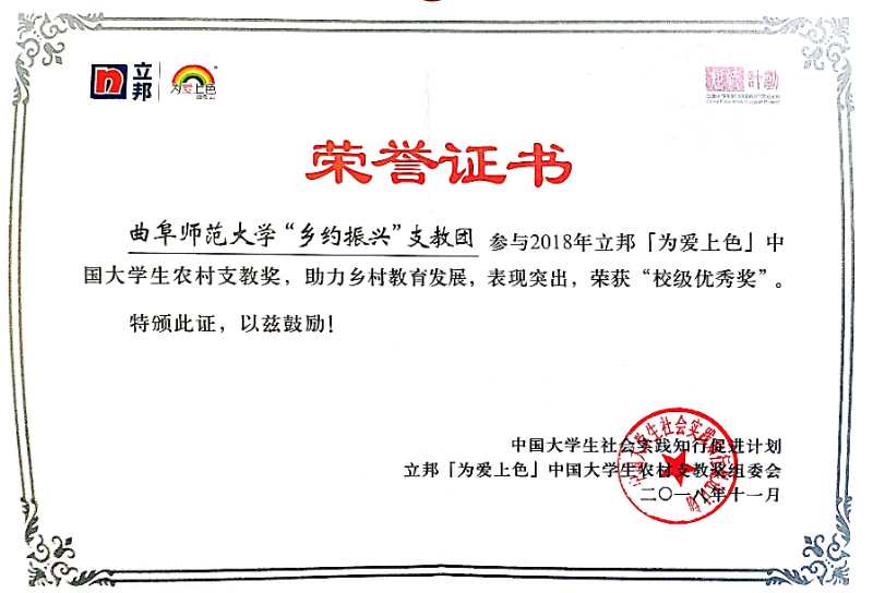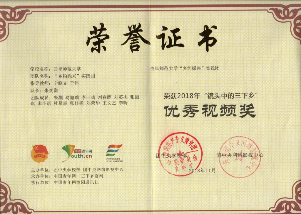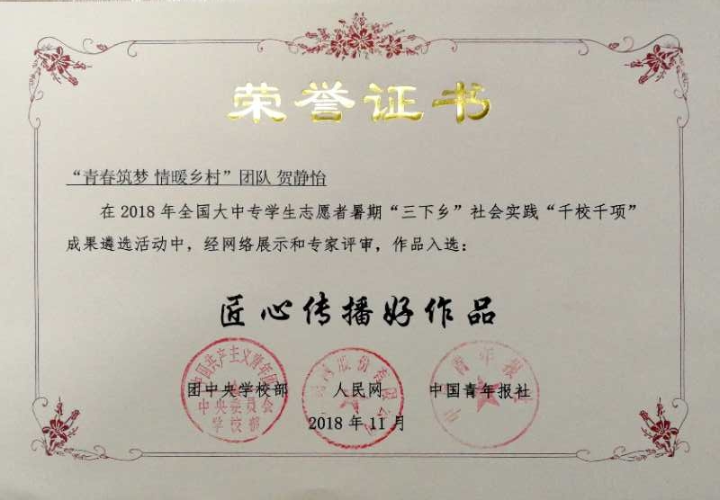 刘伟老师指导的“青春筑梦,情暖乡村”实践团队荣获“匠心传播好作品”。同时,在2018年全国大中专学生志愿者暑期“三下乡”社会实践“镜头中的三下乡”活动中,宁晓文老师、于伟老师指导的“乡约振兴”实践团获得“优秀视频奖”。在团中央学校部“中国大学生社会实践知行促进计划” 第二届「为爱上色」大学生农村支教活动中,“乡约振兴”实践团荣获“校级优秀奖”。至此,我院2018年暑期大学生社会实践活动取得了2个团队三次获得团中央嘉奖,2个团队荣获省级优秀社会实践服务队,刘伟、宁晓文、于伟3位指导教师荣获省“优秀指导教师”、刘克晓等11人获得“省大中专学生志愿者暑期‘三下乡’社会实践活动优秀学生”的优异成绩。
