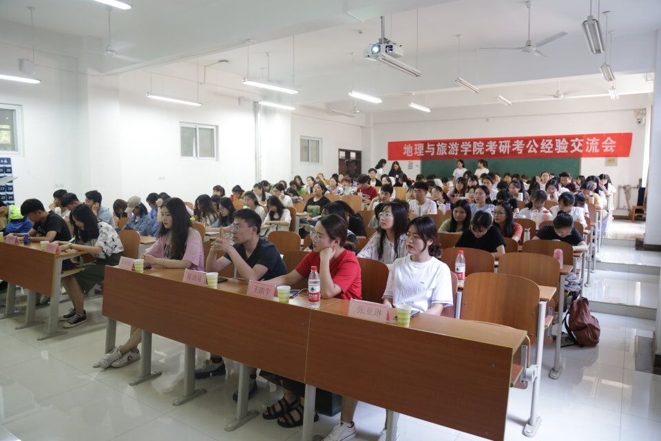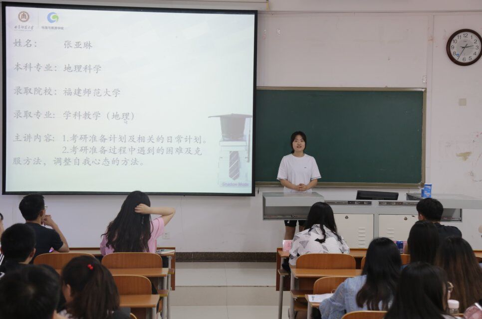 会上,主持人对参加本次交流会的嘉宾进行简单介绍,并指出此次交流会主要针对自然地理与资源环境、人文地理与城乡规划、地理科学专业的学生。7位学生代表分别从报考学校、考研备战、学习计划、心态调整、参考资料的选择和面试技巧等方面进行分享。彭思佳讲述了自己的面试经历,从专业知识和应对导师提问两个方面给同学们提出建议。崔朝峰就考研过程中时间的安排和资料的选择进行讲解,张亚琳主要介绍了考研过程中心态的调整。讲解结束后,同学们对自己感兴趣的问题进行提问,师哥师姐们悉心回答。他们用亲身经历告诉与会人员,考研是一个漫长而艰苦的过程,要做好计划持之以恒,才能实现目标。