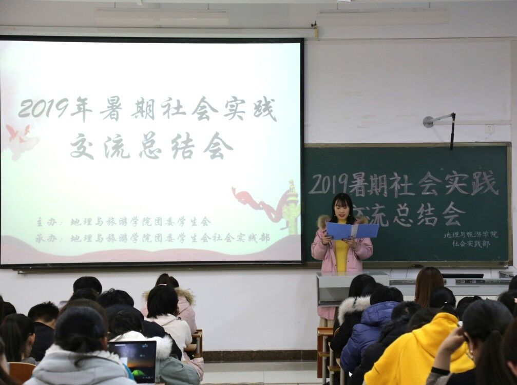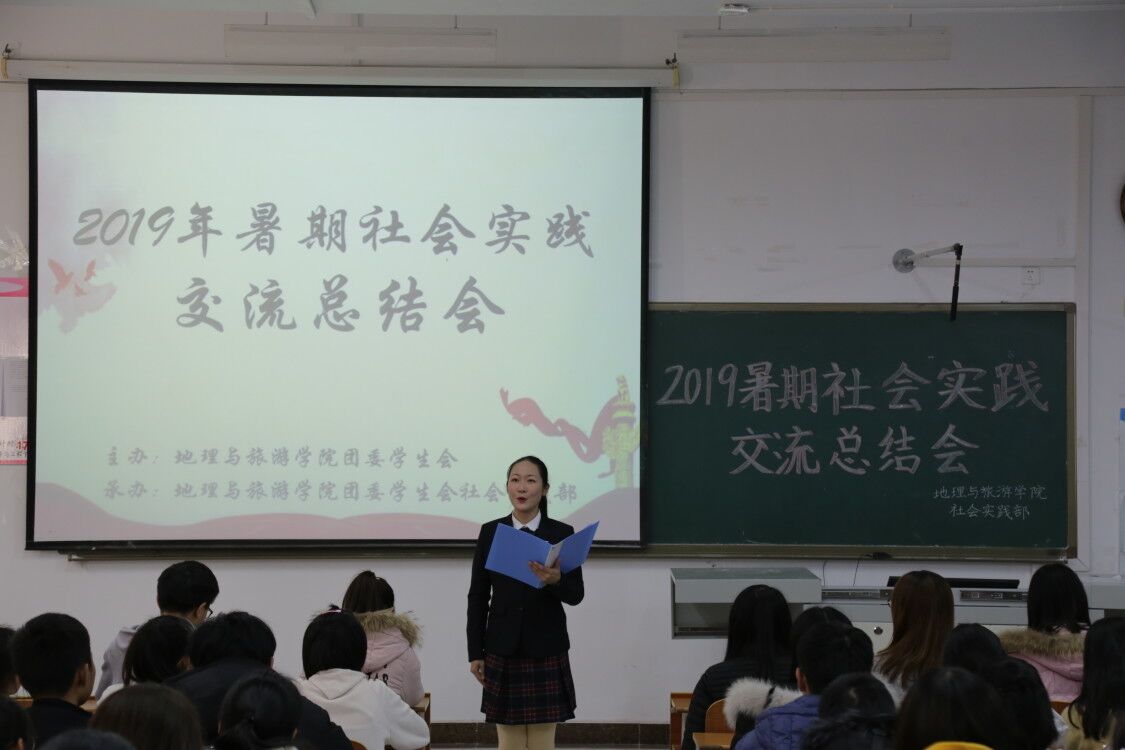在社会实践活动中继续保持优秀的姿态,展现地理学子的独特魅力。随后,社会实践部部长宗宇对2019年暑期社会实践进行成果总结,她希望同学们将实践成果巩固,直面问题,解决问题,并预祝2020年寒假社会实践再创佳绩。