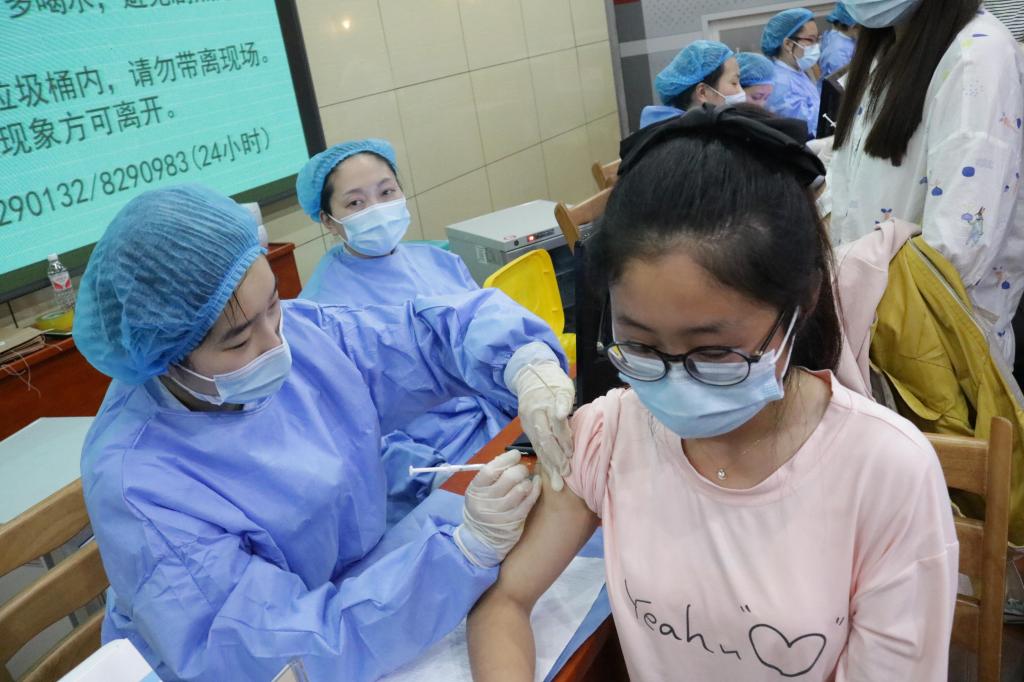 同学们有序排队接种