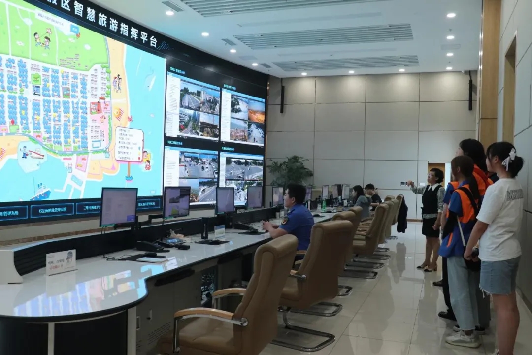 7月18日下午,实践队员顺利抵达日照市山海天旅游度假区,山海天旅游度假区文化和旅游局副局长李苇对实践队的到来表示热烈的欢迎,先对日照山海天旅游度假区智慧旅游指挥平台进行了详细的介绍。该平台,整合了社会综治“雪亮工程”,公安“天网系统”,交警道路监控,旅游景区监控,大项目建设系统等七大视频监控系统,对全区社会面和道路、景点、民俗村实时监管。实践队员观看了山海天安全防范措施,无人机投放游泳圈等一系列救援防护措施。从实际出发,亲身体验智慧旅游指挥平台。实践队员在体验结束后纷纷表示,将科技融入生活,既提高效率又提高了救援人员的安全系数,在以后的实践中,也要努力探索科技与实践相融合。山海天旅游度假区,将科技与旅游融为一体,顺应时代潮流,保障人民生命财产安全,点亮了美好未来。