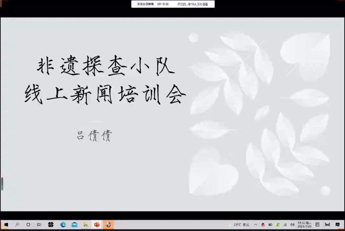 为进一步加深实践队员对本次实践内容的理解,做好实践的分工任务,保证社会实践活动顺利进行,2021720日,非遗勘查小队在线上举行新闻写作培训会议,本次会议实践队员全员参加,由实践队长吕倩倩主持。