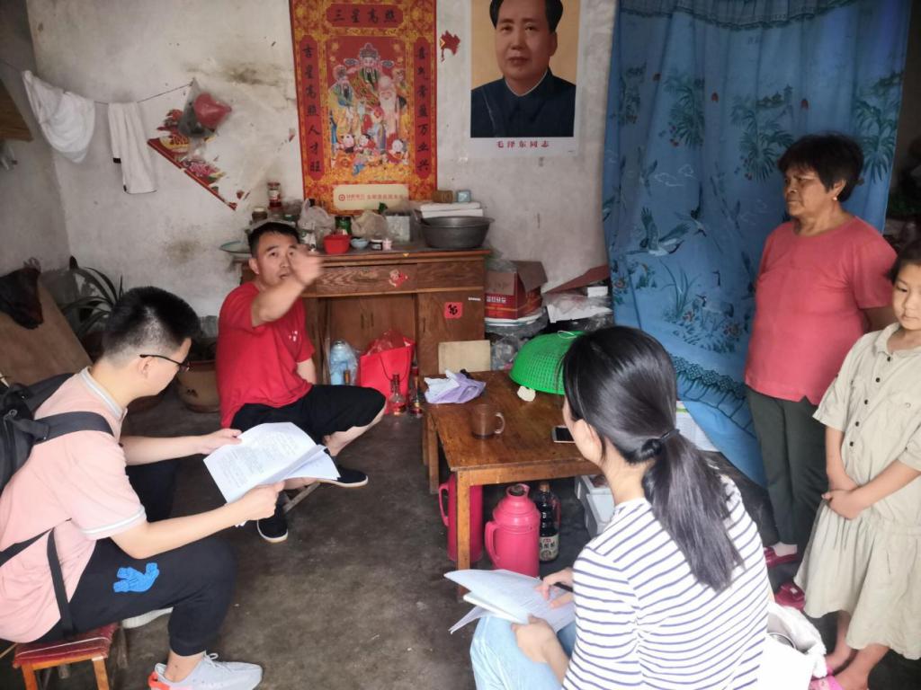 调查问卷由五部分组成:首先,关于村民家庭基本状况,包括住址、区位条件、家庭总人口数、常住人口数、年龄、受教育水平、从事行业、劳动力流向等,其次,有关农户土地利用状况分为耕地基本特征和土地流转状况,包括土地数量、农作物种植情况以及土地流转数量、方式、原因等。实践队队员基于“农户土地利用现状”对“耕地非粮化情况”和“耕地投入情况”进行选择性提问,最后对耕地细碎化整治意愿进行采访调查。“星光不负守田人”实践队以分组形式进行走访调查,每组三名成员分工协作,一名队员主要进行提问,一名成员做好问卷填写工作,另一名成员则在一旁对问卷涉及到的问题进行补充说明。