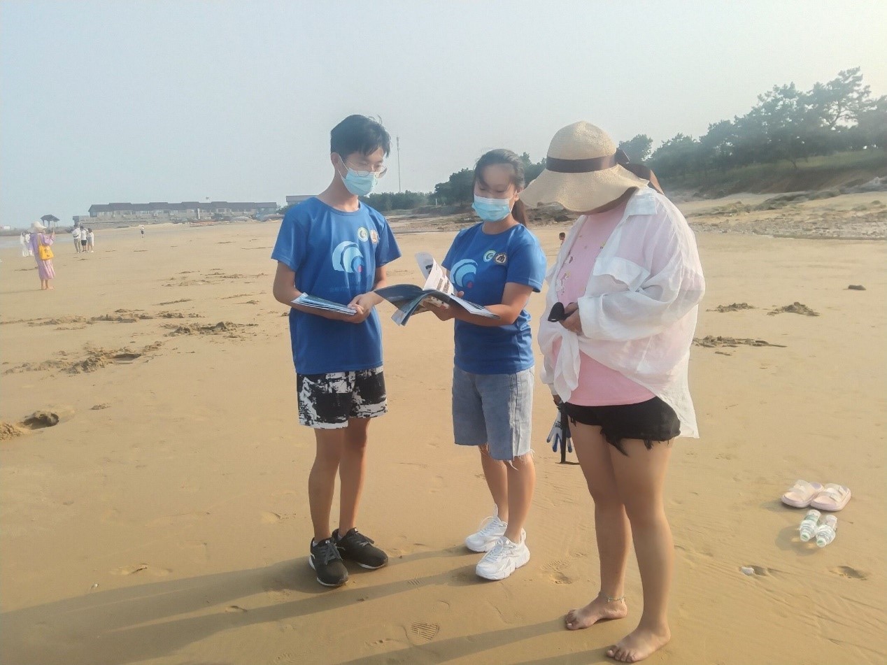 青春服务队成员来到美丽的滨海景区—山海天阳光海滩景区。在炎热的夏日,志愿者们不畏高温,不辞辛劳,身穿蓝色小海螺队服,在海滩上向市民和游客进行细致耐心的文明旅游宣传,并发放旅游地图、旅游折页,提醒来此处游玩的游客提前了解疫情防控规定,遵守景区“预约、错峰、限流”措施,遵守旅游活动中的疫情防护要求和文明旅游规定,不随手乱扔垃圾,爱护生态环境,积极营造文明有序的旅游环境。针对游客们提出的问题,志愿者黄一凡对其进行耐心细致的解答,并热情的介绍日照的著名景点,外地游客连连称谢。志愿者们积极为市民和游客提供问询服务,展示了文明有礼的志愿服务青年形象,赢得了游客的赞赏。“来到美丽的海滩,整个人心情都很放松,也会想要主动爱护生态环境,维护这里的碧海蓝天。”,游客王女士说。在宣传文明出游理念的过程中,志愿服务者们明显感受到,随着“绿水青山就是金山银山”理念的普及,人民群众保护自然环境的意识明显加强,构建人与自然和谐共生观念成效显著。
