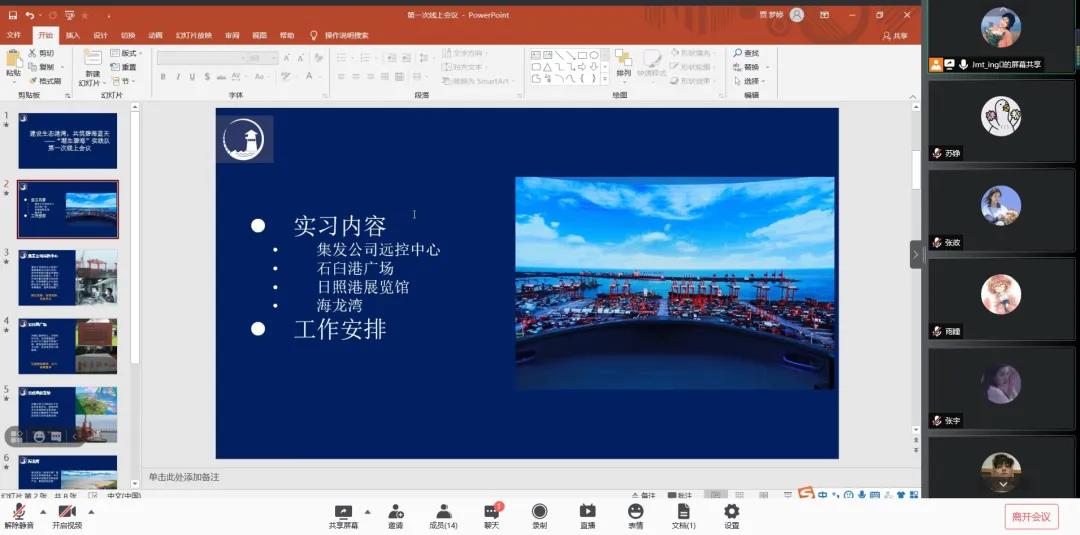 本次线上会议主要分为两大模块:介绍实践内容和安排后续工作。队长贾梦婷首先向大家介绍了日照港的大致情况,并从多个方面详细介绍了集发公司远控中心、石臼港广场、日照港展览馆和海龙湾四个实践地点的调研情况和各自的发展方向。围绕“国情观察”这一主题,本次实践活动主要着眼于日照港的产业发展现状和生态转型项目进程。