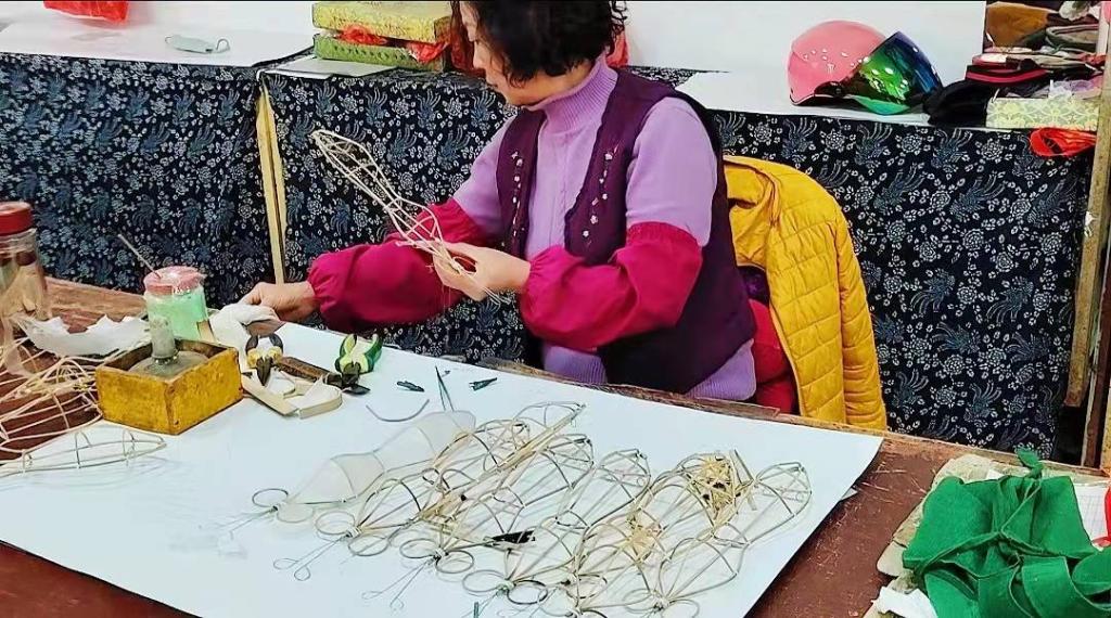 图为风筝制作师傅正搭建风筝轮廓