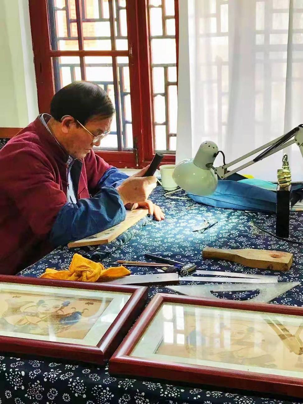 在潍坊市杨家埠民间艺术大观园年画雕刻作坊里,62岁的颜克臣师傅正拿着刻刀,聚精会神的雕刻木板。这是他与木板年画结缘的第41个年头。一块木板,一把刻刀,颜师傅便是在这里雕刻了岁月,亦雕琢了他的人生,据颜师傅介绍杨家埠年画生产分绘画、雕刻、印刷、装裱等几道工序,每一道工序都极为精细准确。做法是先将画稿勾出黑线稿,贴到刨平的梨木或棠木板上,雕刻出主线版。待印出主线稿后,再分别不同颜色,刻出色版,套色印刷,最后修版装裱而成。 而掌握这项技艺则需要三到五年的时间,队员们观看了颜师傅制作年画的过程,从简单的打稿到流利的雕刻线条,年画艺人的精雕细琢流露出了传统的美,让队员们感受到了浓厚的民族信仰,精巧的图案亦是民族信仰和价值观念的视觉化呈现,队员们采访了附近的老百姓,他们相信,印在纸上的吉祥图案会带来好运,让我们体会到在对美好生活的向往方面,古今相通。