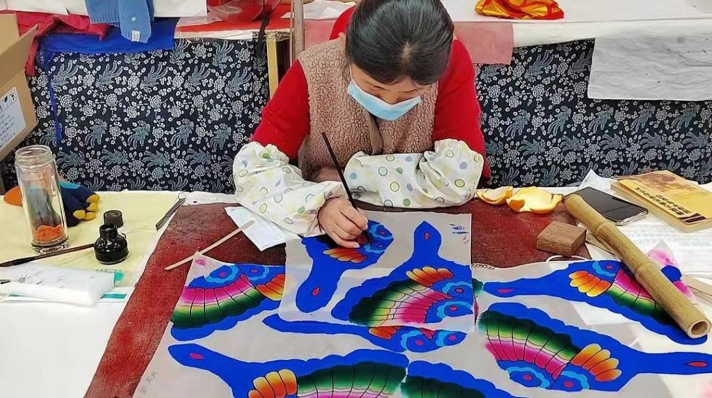 图为风筝师傅正绘制风筝图案