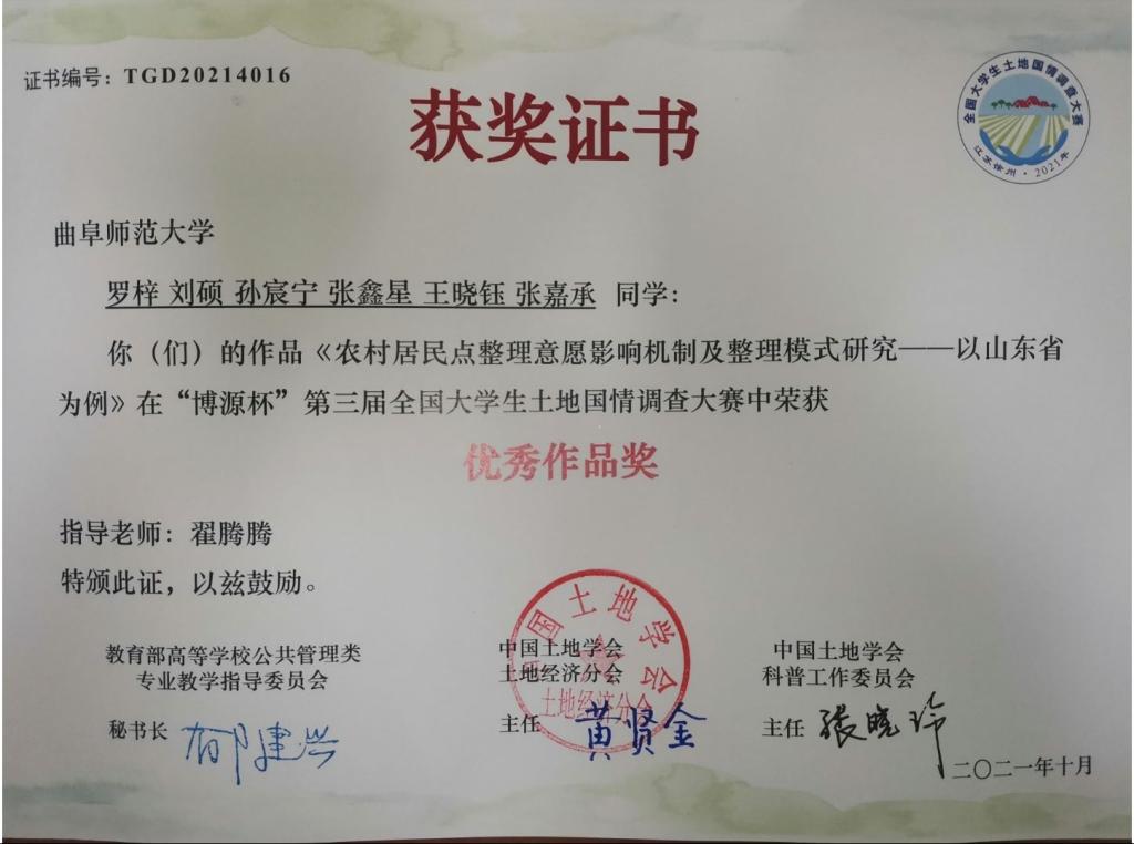 “'博源杯'第三届全国大学生土地国情调查大赛”中斩获优秀作品奖