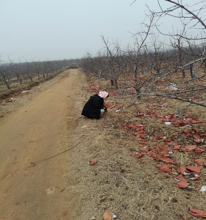 图为队员观察果园丢弃的果袋
