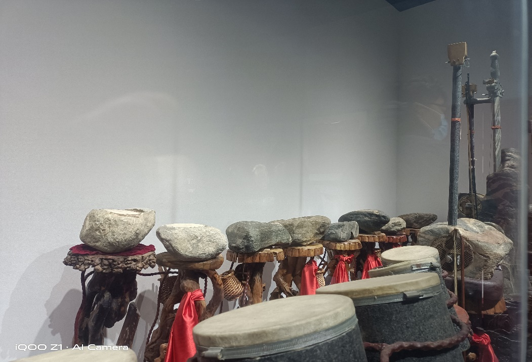 展厅的众多非物质文化遗产中,最为吸引我的,毫无疑问是泰山石乐。作为泰安市非遗项目,泰山石乐有着5000年的历史深度,是泰山文化元素的拓展与升华。它用音乐的形式赋予泰山石以鲜活的生命,使其闪烁着天籁般的艺术张力。我感慨万千,泰山石乐在泰山文化的血统里创新性地塑造了特别的泰山的音乐形象,行走在独特个性的音乐之路上。我的思绪飘回到远古时代,可以想象,在那时,泰山先民在祭祀泰山仪式“柴望”中,击石为乐,祭祀天地的场景是何等的壮观。如今,泰山古刹“普照寺”至今仍遗存有著名的五音石。这些乐器至今仍有实用价值,一些石乐的演奏家们还会定期的举办石乐演奏,为观赏者带来视听的享受,让我们感受这种古拙大气的石乐的气势与悠扬。岁月没有将它消磨,反而使其独特的美感熠熠生辉。