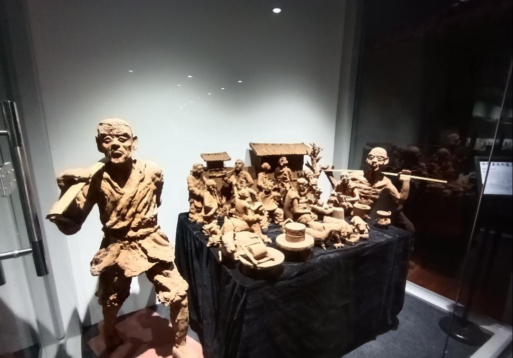 展厅里还陈列了“泥巴魏”的泥塑作品。“泥巴魏”泥塑起源于光绪年间,由新泰市石莱苏家庄的魏殿东所创。其在农闲时间用泥巴捏出漂亮的人物、动物等题材的作品,在春节、庙会时出售以贴补家用。泥巴魏已传到了第四代传人魏杰手中。从作品中,我们可以看到传承人坚持匠心制作,在传承的基础上不断创新,逐渐形成了夸张变形、风趣幽默的个人风格。传承人的作品大多以农村劳作的场景和人物为主,艺术取自于生活中细致入微的观察,以实现对乡村田园独特魅力的呈现,也是乡愁记忆进行艺术再现。泥塑作品古朴中蕴藏着精致,看似简单的造型背后是对人物神态特质的细腻呈现,需要非遗传承人日积月累的观察和对技艺的不断完善、坚持反复打磨的匠心才能呈现出这样深入人心的作品。