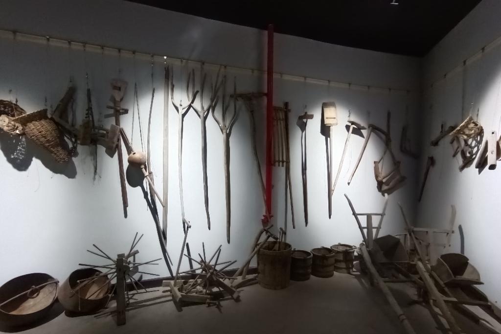 我们走进泰安美术馆的民俗文化展厅。讲解员首先带我们参观“泰山人家”。该展厅中陈列了一些传统民居内的摆设和生活起居用品,有织布机、八柱床等。见到她们时,一股浓厚的生活气息便扑面而来,仿佛那些过去的生活场景就在眼前。同时,各式各样的农具更是让我们感受到了农家生活的辛劳,忆苦思甜让我们更加感恩于现在生活的美好。这些传统的生活场景让我们再次深刻的感受到一分耕耘一分收获的道理,在这个日渐浮躁的当下,生活的快节奏成为主流,而保存这样一个充满古朴又不失妙趣横生的灵魂的生活场景,让人们追忆过去,反思当下有着其不可或缺的价值。