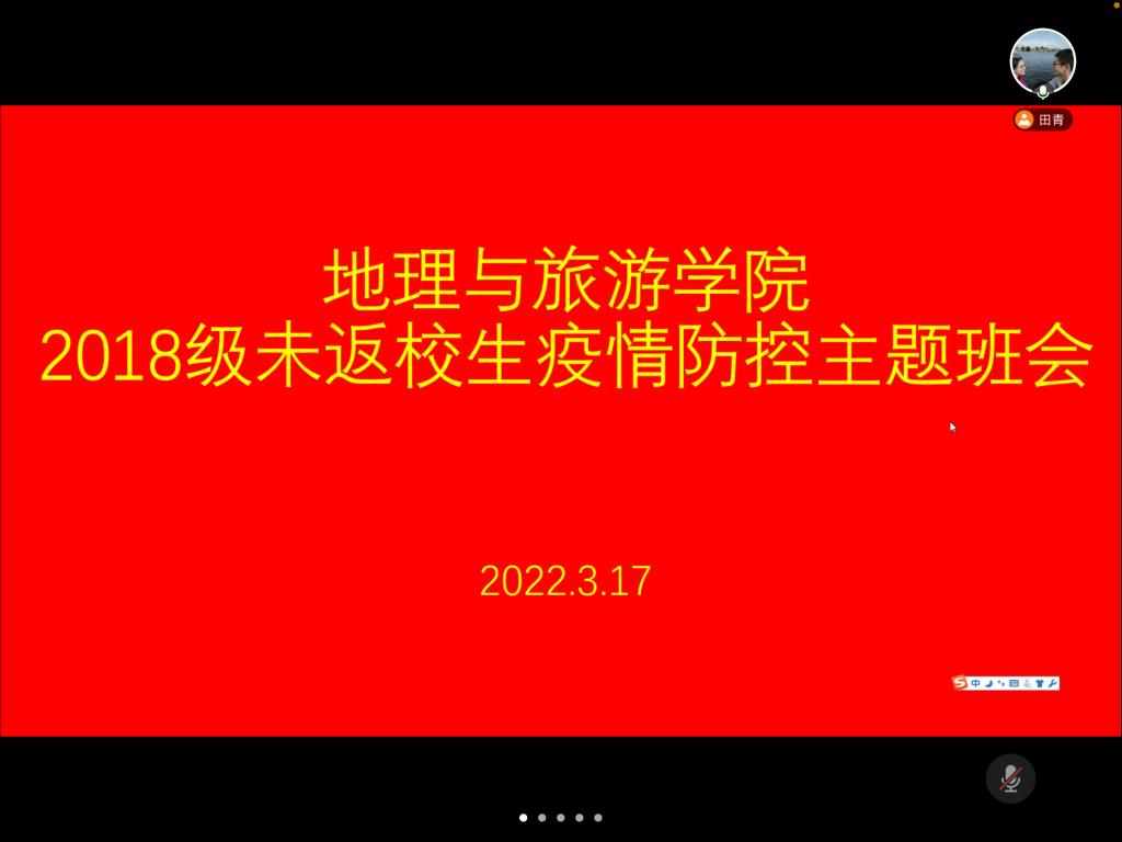 会上,田青老师围绕当前疫情防控形势、疫情防控措施、在家学习和网络安全等方面讲解和部署,引导同学们正确认识目前疫情状况,积极配合学校和属地做好疫情防控工作,尤其是当下面临就业、考研复试等问题,要落实行程汇报和外出请假制度,鼓励同学们以充实、有益的学习生活战胜不必要的疫情恐惧和情绪困扰。希望同学们能切实增强忧患意识,明确认识当下疫情防控的严峻形势,高度重视疫情防控工作,坚决落实学校与属地疫情防控的各种措施,保障好自己的身心健康和生命安全。