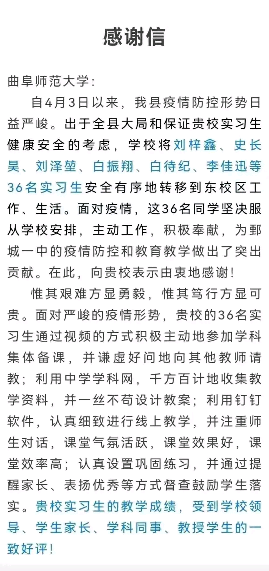 共有52名支教学生分布在全省各地的教学一线,为当地基础教育贡献自己的光和热。在抗击疫情开展线上教学过程中,我校学子积极参加学科集体备课,谦虚好问;主动收集教学资料,一丝不苟设计教案;认真细致进行线上教学,课堂效果好、效率高。他们的教学表现赢得了学校领导、学生家长、学科同事和学生的一致好评。