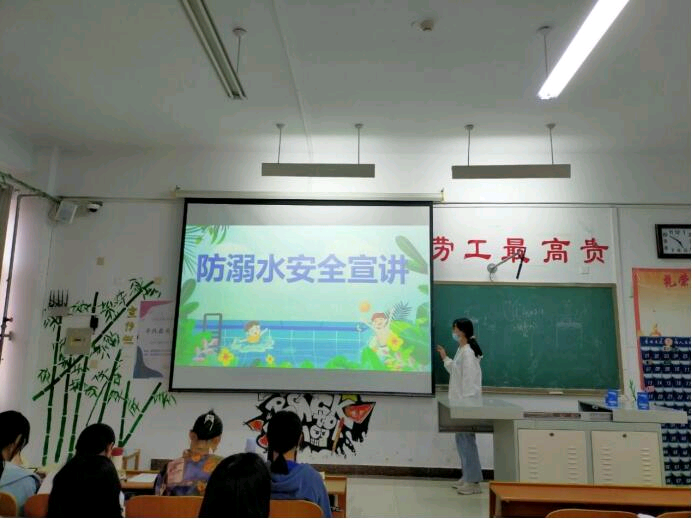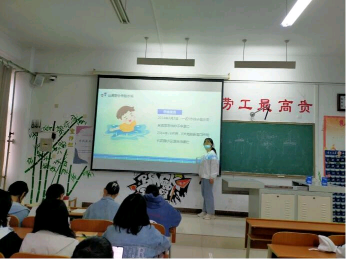 班会中,主讲人深入浅出、图文并茂,围绕“提高自救、杜绝溺水”主题,从游泳水域选择、游泳注意事项以及施救与自救三方面,提醒同学们选择安全水域进行游泳,注意热身与安全防护,溺水时注意正确营救方式。针对夏季特别是汛期易发生暴雨、洪水等自然灾害,各主讲人为同学们普及洪水类型,讲解面对洪水时的应对措施,让同学们在发生安全事故时能做到正确自我保护。