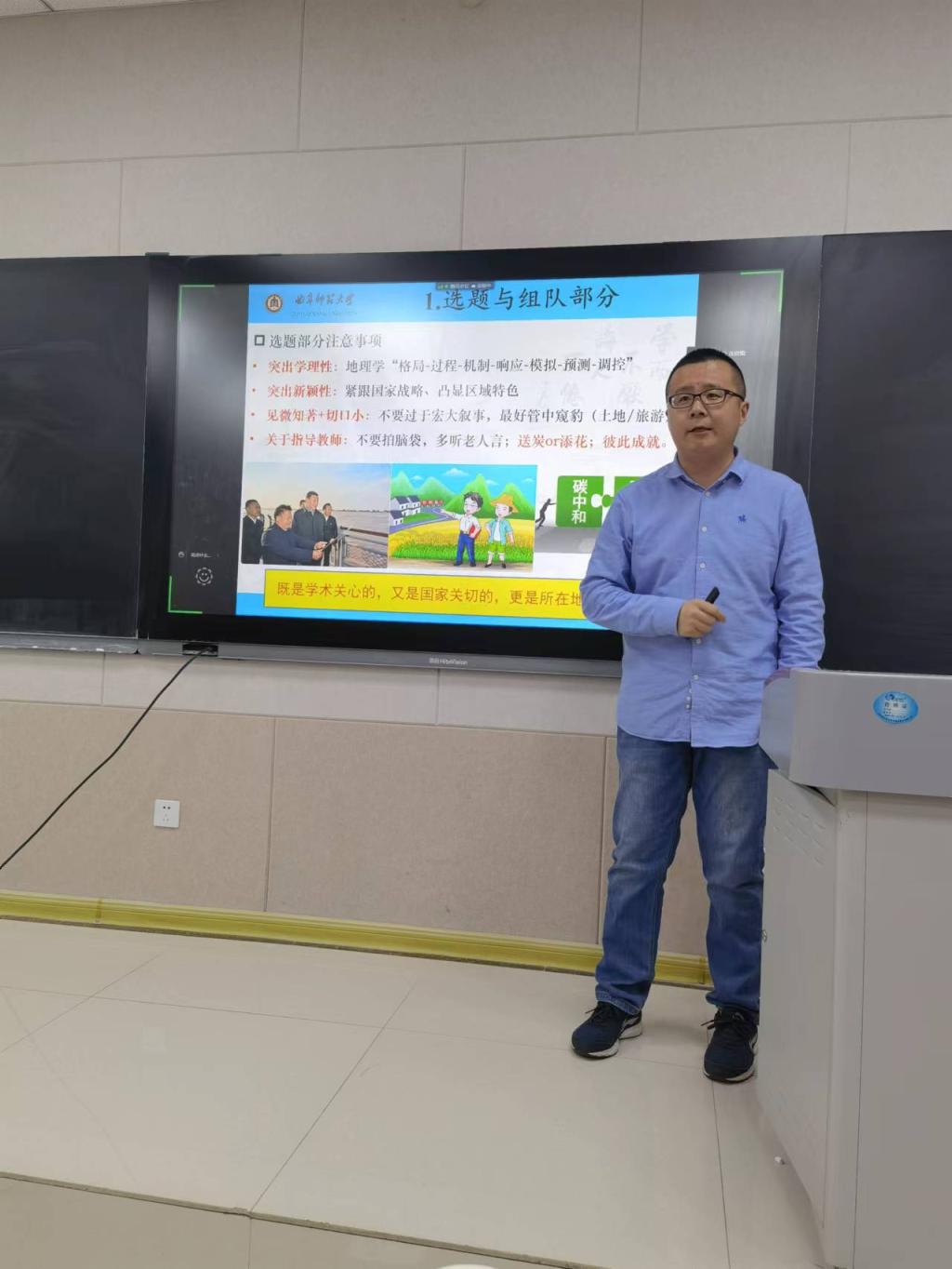交流会伊始,刘伟指出科创教育的重要性和意义。他强调科技创新已成为时代潮流,鼓励地理学子要响应时代号召,积极投身到科技创新中去。赵林从本科生可以参与的科研活动、科研项目的选题及论文的撰写等方面为大家介绍科研小白如何参与科研活动。“人间哪有参天树,一土一石堆成山。”他用详实的案例和丰富的经验告诉我们,科研不是一朝一夕之事;他指出科创比赛并不是可望不可及,同学们要积极参加各种科创比赛,平时增加论文阅读量,提高学科素养和科创能力,分清各类比赛的主次顺序,不要盲目寻求数量,要重视质量,多与同学、老师交流,集思广益,团体的力量大于个人的力量。王世清从学生的角度为大家介绍参与科研活动的经历、大创项目的申报以及科研项目对于学生自身发展的重要性等,用贴近学生生活的科研经历,讲述研究过程的苦与甜,激发学生对科研的兴趣,从而增加同学们对科研活动的了解,培养学生个人的学术素养。