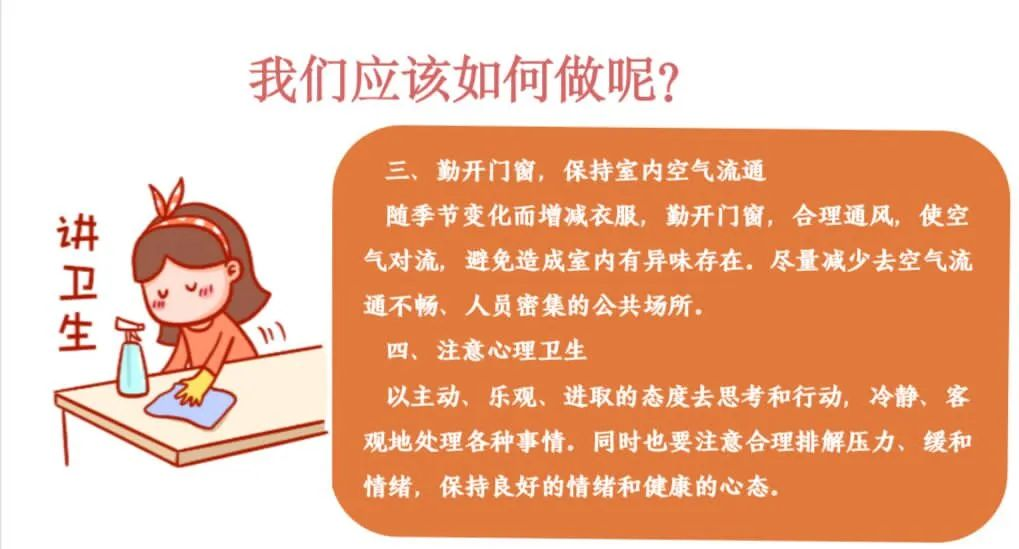 三、勤开门窗,保持室内空气流通。随季节变化而增减衣服,勤开门窗,合理通风,使空气对流,把人体呼出的二氧化碳等气体随着空气排到外面去,避免造成室内有异味存在等问题。尽量减少去空气流通不畅、人员密集的公共场所。