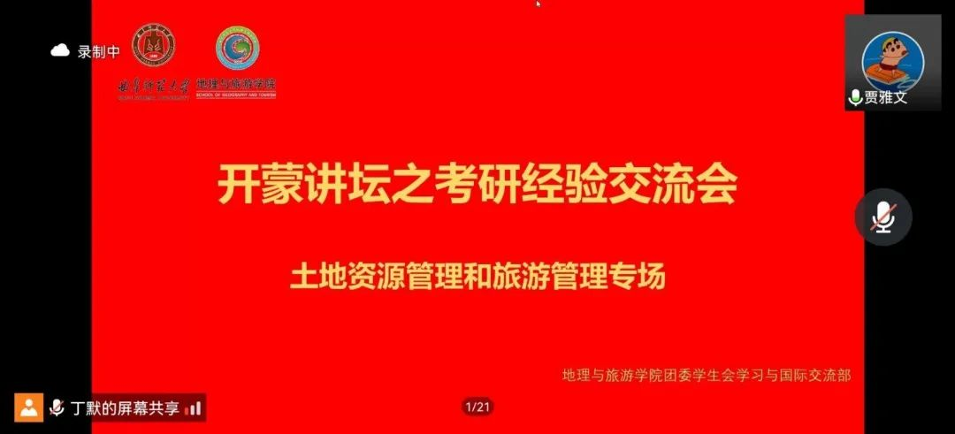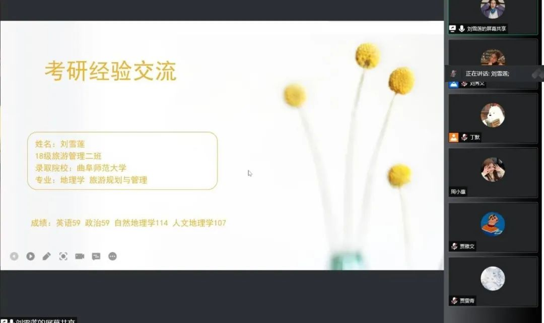 举办开蒙讲坛之土地资源管理和旅游管理专场考研经验交流会。本次交流会采用线上会议形式,考研优秀代表谭斐、王京哲、张湘、孙贝贝、董淑敏、刘雪莲主讲,各级学生积极参加。