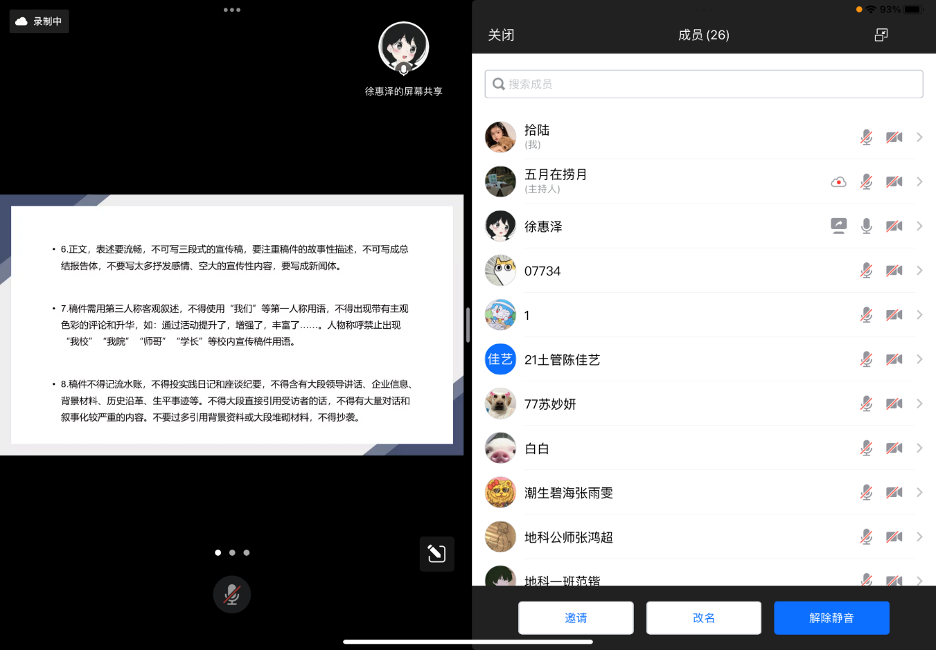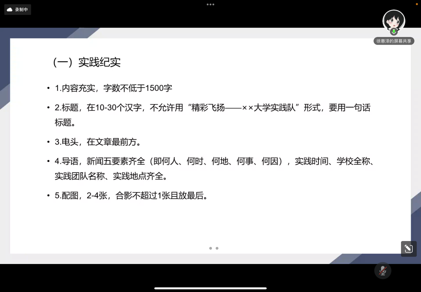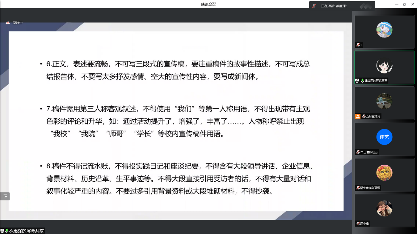 本次会议内容分为“社会实践新闻写作指导”、“社会实践院公众号投稿要求”、“社会实践网站投稿要求”和“社会实践微博投稿要求”四个部分。首先,徐惠泽从“实践纪实”、“感悟收获”、“实践图片”三个方面讲起,帮助大家理解社会实践新闻,规范不同文稿写作格式,为新闻撰写添光添彩。接着,付丰赫向参会人员详细介绍了各类公众号平台的投稿途径和投稿要求,帮助各队伍了解校内投稿途径,减少不必要的失误。最后,王菡向大家介绍了不同社会实践网站与微博投稿方式及要求,重点介绍了中青校园的投稿途径及要求。