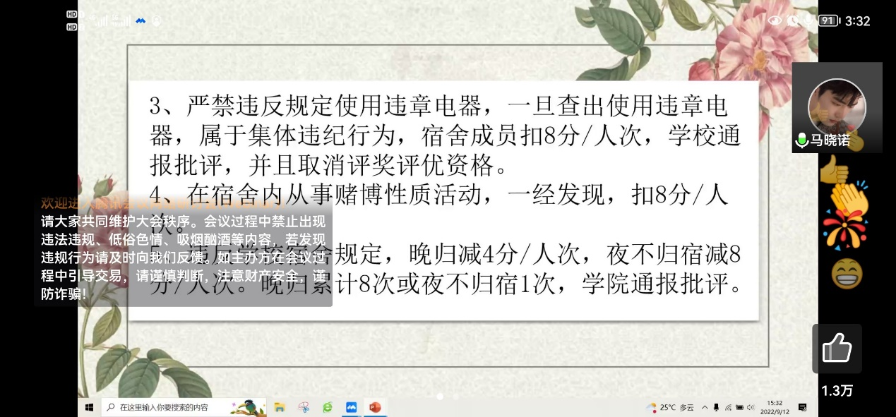 宿舍管理条例,细致讲解了宿舍卫生和宿舍安全等方面的相关内容,引导同学们进一步加深对大学生宿舍生活的了解。纪检部副部长详细介绍了学校规章制度与老虎机