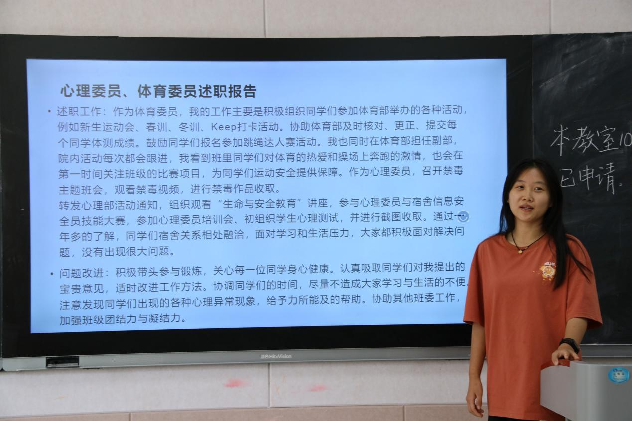 各位班委总结过去,展望未来,将一年以来班集体的各项工作以图文的形式一一展现,建立起各位同学对班委日常工作的简要认知,同时也就工作中存在的不足进行反馈思考,提出未来建议,努力提升工作效能,为班级提供更加优质的服务。述职班会上,各位班委也对老师和同学一年以来的陪伴和支持表示了由衷的感谢。述职之后,全体同学认真填写班委工作测评表,结合班委日常工作和述职情况,客观公正地为每一位班委评分。