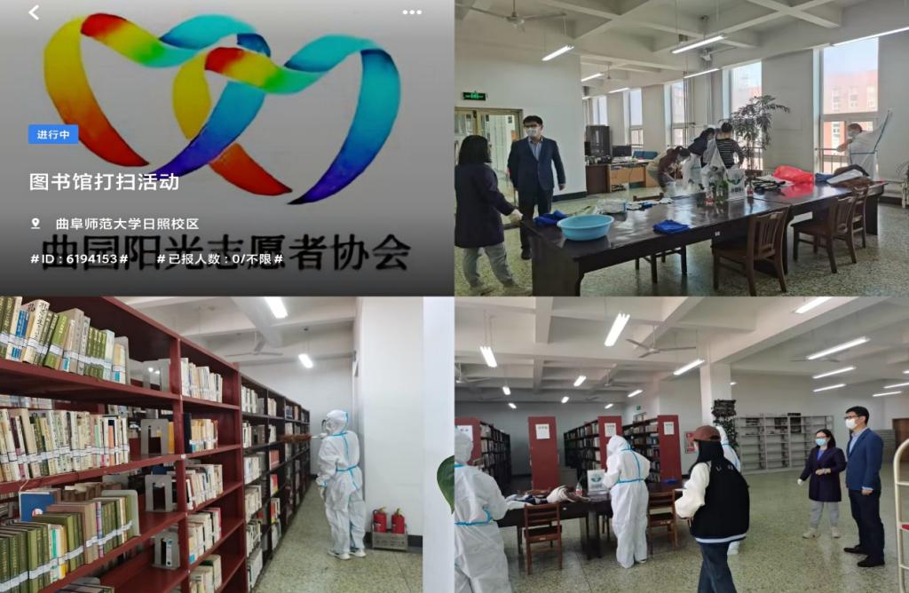 为丰富当代大学生的课余生活,发扬“不怕苦,不怕累”的精神,加强同学们的爱书爱馆意识,传承为他人服务、服务社会、奉献社会的青年志愿者理念,曲园阳光志愿者协会于2022年10月7日在图书馆举办了图书馆清扫活动。