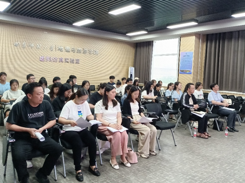 于虚拟仿真实验室举行2021级旅游管理专业企业实习动员会。学院党委书记苏占兵,副院长于伟,旅游管理系主任张瑜,实习指导教师武传震、张岩君、徐凯、谭清月及2021级辅导员董青出席,副院长吴军主持动员会,2021级旅游管理专业全体同学参加会议。