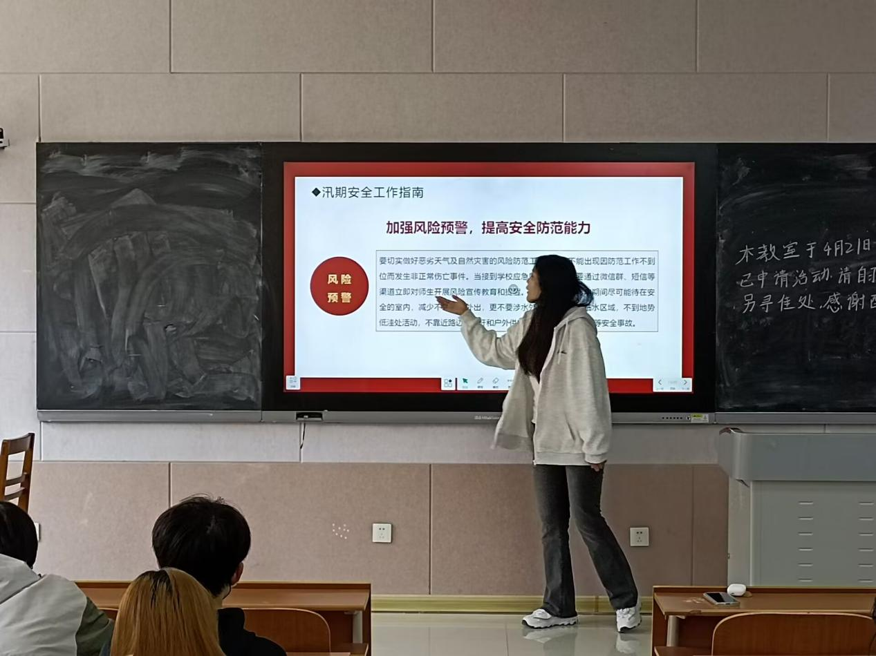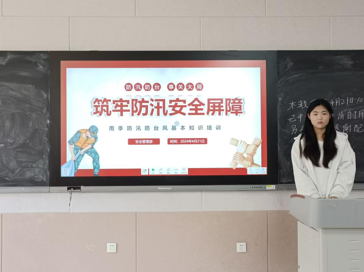 会议伊始,张明迪以“筑牢防汛安全屏障”为主旨,首先详细阐述了防汛防台风的概念,深入剖析了汛期所带来的潜在危害,突显了防汛防台风工作的重要性。随后,他提出了“安全第一,常备不懈,以防为主,全力抢险”的汛期安全工作指南,旨在引导大家时刻保持警惕,严阵以待。在此基础上,张明迪进一步向同学们普及了汛期的自救知识,强调在遭遇紧急情况时,应迅速拨打救援电话,并提醒大家要把握逃生的黄金时机。为了确保信息的有效传达,张明迪还播放了多个关于防汛防台风的视频资料,内容生动具体,引发了同学们浓厚的兴趣,并对防汛防台风有了更加深入的认识和理解。