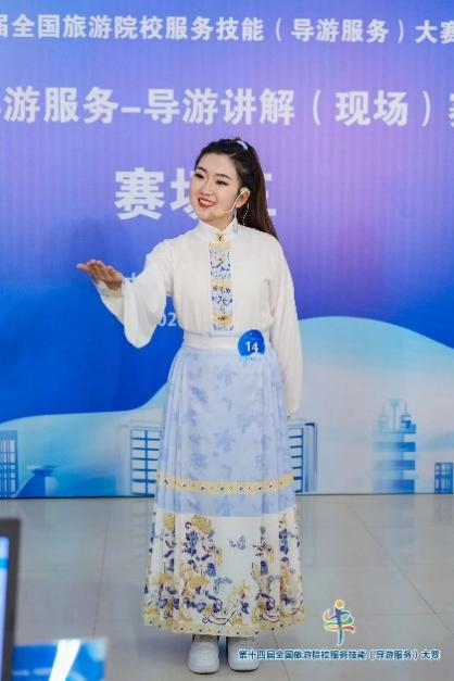 第十四届全国旅游院校服务技能(导游服务)大赛共有来自全国30个省、自治区、直辖市的303所高等院校和中职学校的883名选手报名参赛。比赛设普通话导游服务和英语导游服务两个项目,每个项目由理论考核、导游讲解、才艺展示三个部分组成,旨在考查学生的综合能力。大赛为各位参赛选手提供了展示技能、切磋技艺、成长成才的平台,共聘请46位权威专家担任裁判,并采用专门的评分系统,即时公布选手成绩,确保比赛的公平、公正、公开。