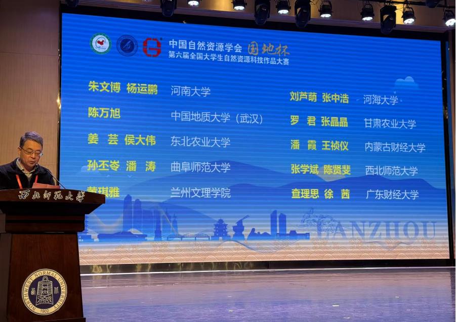 2024年10月25-26日,由中国自然资源学会主办的中国自然资源学会“国地杯”第六届全国大学生自然资源科技作品大赛决赛于西北师范大学成功落下帷幕。本届大赛以“锚定自然资源科技创新 蓄势赋能新质生产力”为主题,共收到有效作品196份,经过大赛评审组的层层遴选、优中选优,最终确定68项作品入围决赛,32项作品授予优秀作品奖。