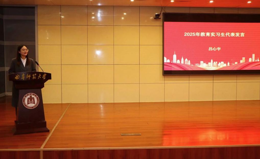2022级地理科学师范生吕心宇作为教育实习生代表发言。她代表全体实习生郑重承诺,严格遵守教育实习相关规定,尽力所为,高质量完成教育教学实习任务,提高教育水平和教学技能,为学校学院争光,为自己的人生添彩。