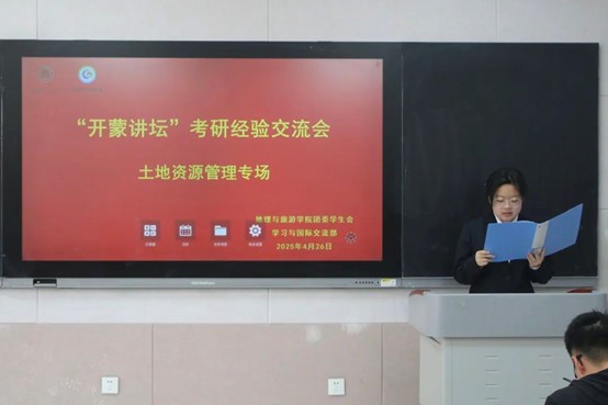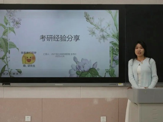 本次考研经验交流会分为旅游管理和土地资源管理专场。在旅游管理专场交流中,上岸扬州大学哲学专业的吴爽建议大家明确自己的考研方向,综合各类资料分析适合自己的专业与院校,并提醒大家在复习时要回归课本大纲,注重时间规划,保持良好的心态。跨考本校职业技术教育专业的解欣雨围绕院校选择展开讲解,她分析择校的几种途径,并与大家分享选择本校的优势。跨考福州大学环境科学专业的王磊强调择校重要性的同时,着重为大家提出如何高效备考英语的建议。