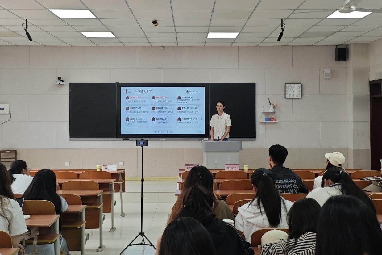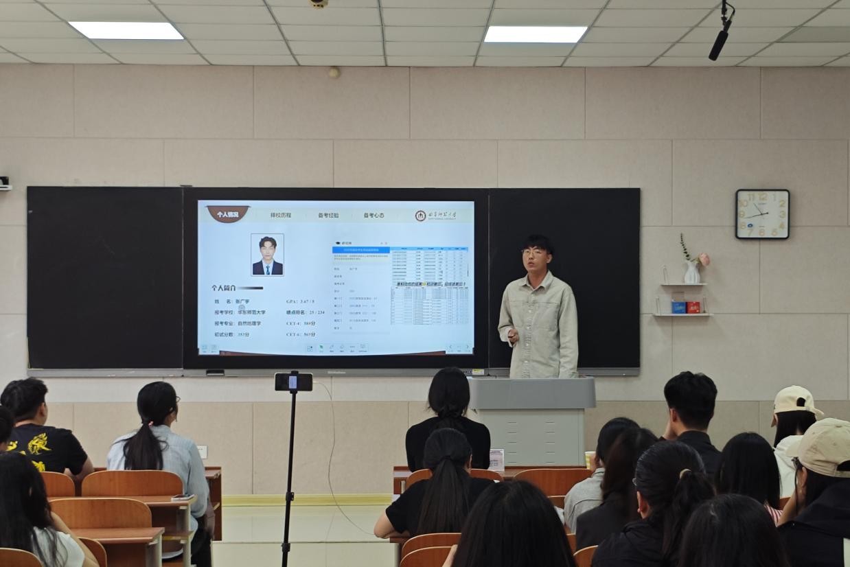 516日,召开地图学与地理信息系统、跨专业专场,邀请袁雨霞、刘宁、石鑫红进行经验分享,他们强调同学们在复习时要回归课本大纲,透彻解读相关参考书目,夯实基础知识,及时整理章节框架;生态学与环境地理学专场邀请陈佳艺、邵明阳、王天乐进行经验分享,他们结合备考时的身心感受,分享缓解压力的方法;在自然地理学专场中,王玉茹、张广宇、王怡霏、孙金玉应邀进行经验分享,他们提醒大家提前抵达目标院校熟悉适应环境,通过模拟面试等方式优化临场表现,要注重简历的精准性与本科阶段科研实践成果的展示。